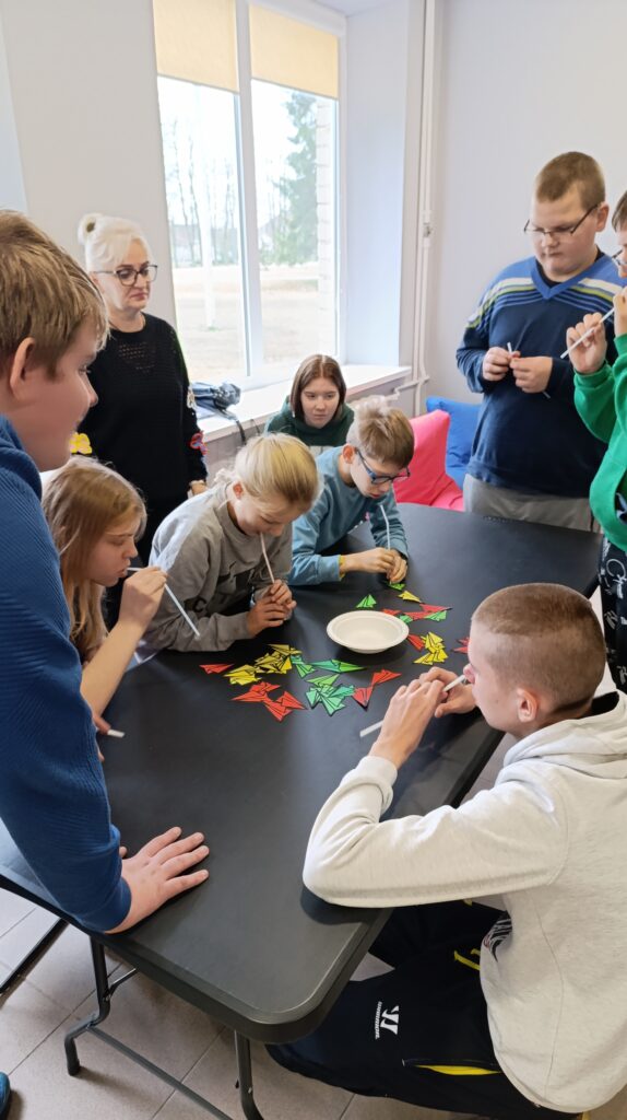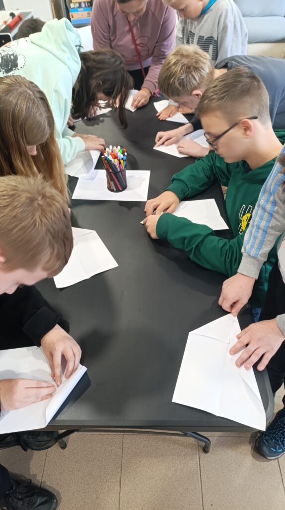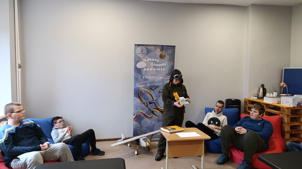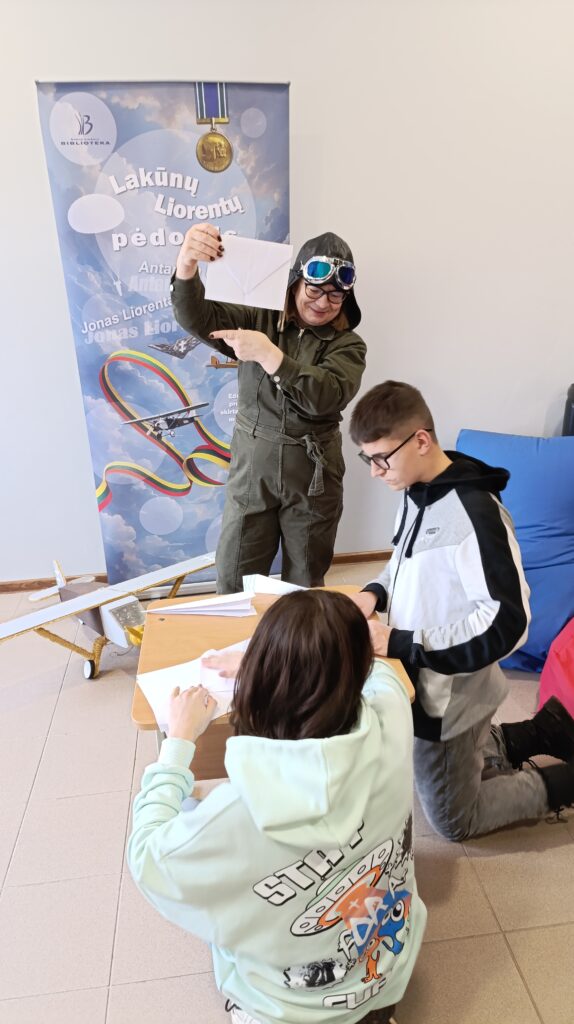 Edukacijos metu apžiūrėjome lakūnams skirtą skulptūrą, keliavome prie vietos, kurioje gyveno Liorentai ir radome ne mažiau kaip 150 metų turintį dvikamienį ąžuolą, kurio plotį bandėme išmatuoti apjuosdami rankomis, o leisdami lėktuvėlius į viršų siekėme pralenkti ąžuolo aukštį. Ech, dar reikia pasistengti….Grįžus į patalpas, laukė mokomoji dalis, kurioje edukatorė Asta supažindino su Liorentų šeimos istorija. Mokiniai įdėmiai klausėsi istorijos apie brolį Joną Liorentą (pulkininką leitenantą, lakūną, kuris su lėktuvėliu ANBO apskrido Europą) ir seserį Antaniną Liorentaitę (pirmąją Lietuvos moterį lakūnę ir parašiutininkę). Po teorinės dalies mokiniai atliko praktines užduotis, kurios padėjo įtvirtinti žinias apie aviaciją ir lakūnus. Mokinių laukė ir kūrybinė užduotis, kurios metu išmoko pasigaminti dviejų tipų lėktuvėlius, o po dekoravimo ir išbandyti lėktuvėlių skrydžių tikslumą. Pravertė ir matematikos žinios, nes reikėjo suskaičiuoti taškus… Galiausiai, edukacijos pabaigoje mokiniai lėktuvėlius išbandė ir lauke, nes varžėsi kurio lėktuvas nuskris toliau… Į centrą grįžome pilni gerų emocijų, praturtėję žiniomis apie savo krašto žymius žmones ir Lietuvos aviaciją.