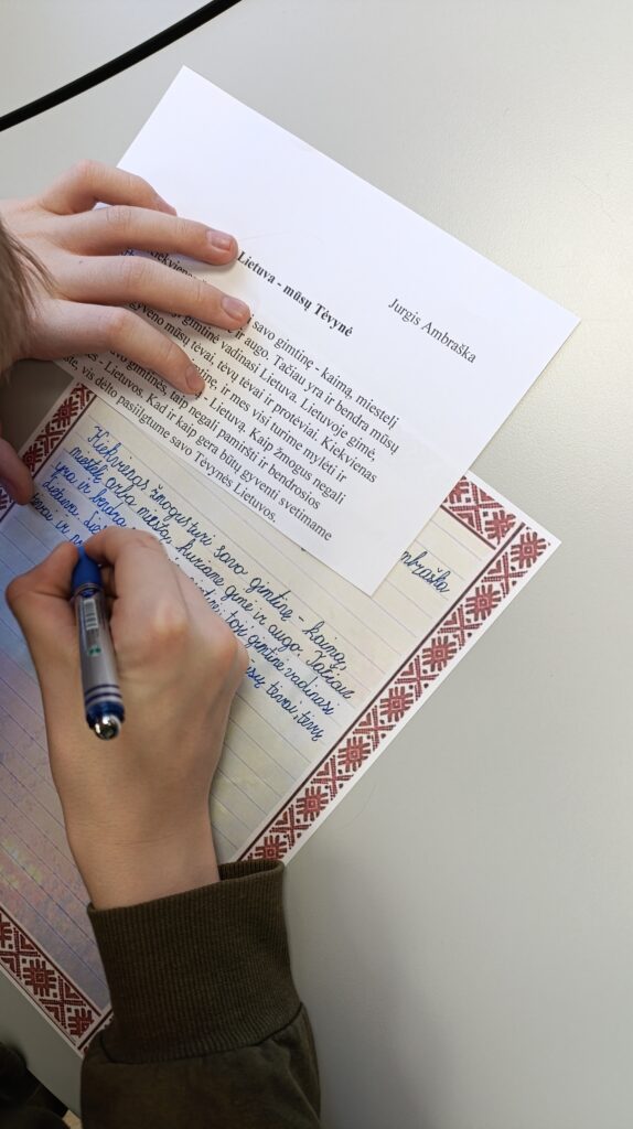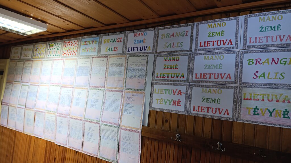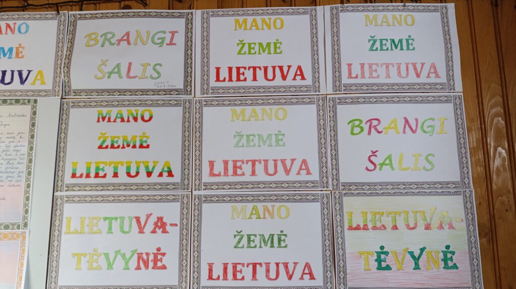 💚Trečios pamokos metu bendruomenė įsitraukė į dailyraščio rašymą apie Lietuvą. Darbai buvo rašomi ant geltonų, žalių ir raudonų lapų, todėl klasėse netrūko Lietuvos vėliavos spalvų. Lavinamųjų klasių mokiniai ir tie, kuriems dailyraštis buvo per sudėtingas, tuo metu spalvino, kūrė aplikacijas, dekoravo žodžius „Gimtinė“, „Tėvynė, „Lietuva- tėvynė“…